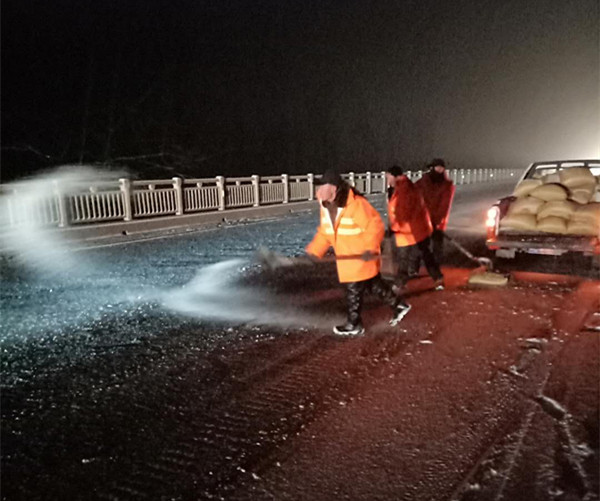 图为公路处工作人员撒布融雪盐