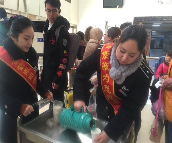 图为客运站工作人员为旅客提供热水