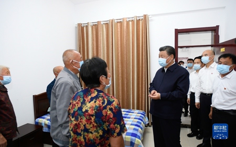 9月13日至14日,中共中央总书记、国家主席、中央军委主席习近平在陕西省榆林市考察。这是14日下午,习近平在绥德县张家砭镇郝家桥村互助幸福院,同村里的老人亲切交流。新华社记者 李学仁 摄